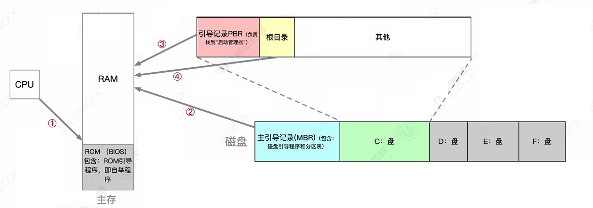 ①CPU从BIOS(储存在主板的ROM上,而不是内存条中)中读取引导程序,用于进行硬件自检
