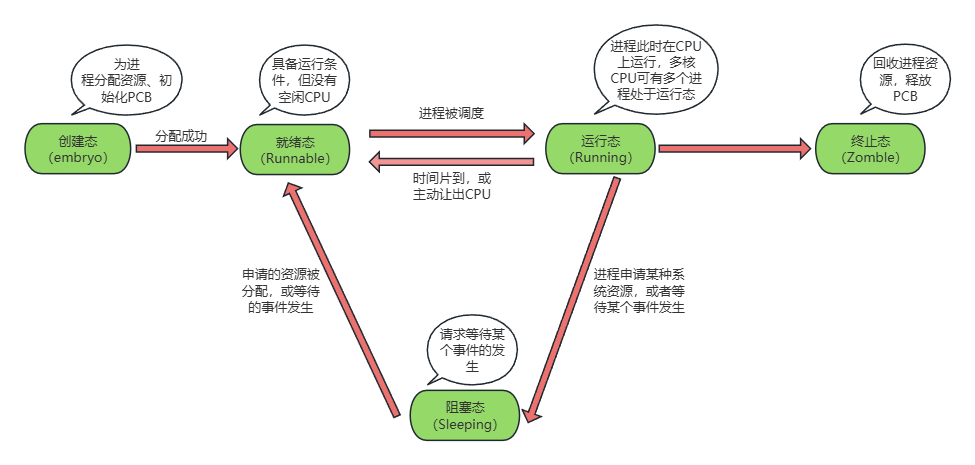 - 用户态—>内核态:CPU检测到中断信号后,硬件自动完成内核态转化过程,转而运行处理中断信号的内核程序