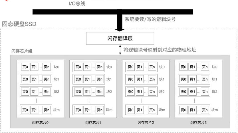 每个页仅可以写一次,如果某块已经写入数据的页需要修改,需要将这一块的其他数据移动到新块,在新块对应的页写入修改后的数据。由闪存翻译层进行逻辑地址的重新映射。