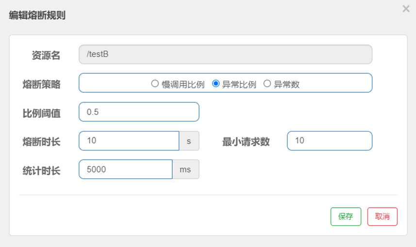 degradeRule.setGrade(1); // 设置熔断策略,0表示平均响应时间,1表示异常比例