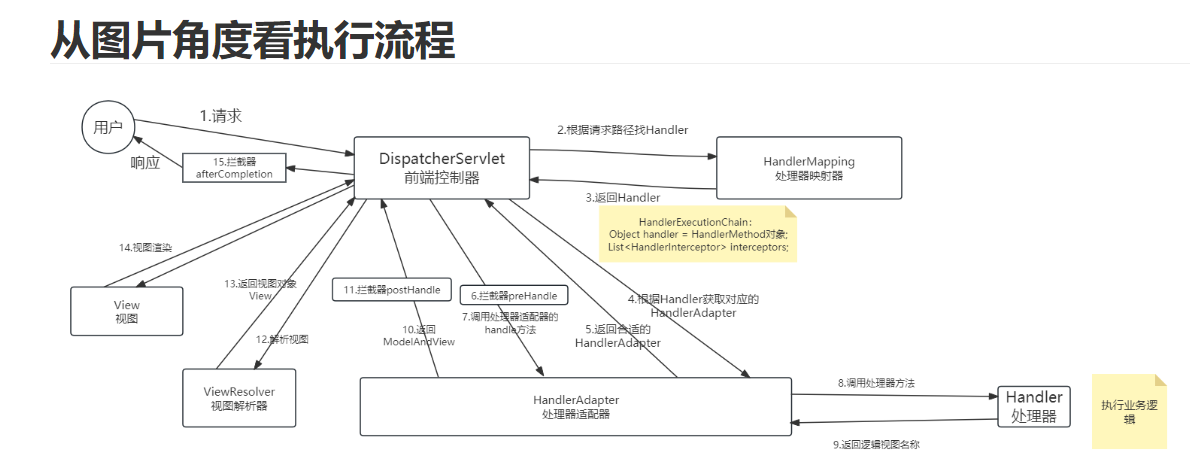 访问到目标资源后:根据该URI,调用HandlerMapping获得该Handler配置的所有相关的对象(包括Handler对象以及Handler对象对应的拦截器),最后以HandlerExecutionChain执行链对象的形式返回。