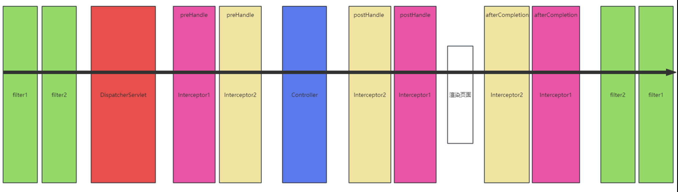 - 先经过过滤器——>DispatchServlet——>拦截器——>Controller