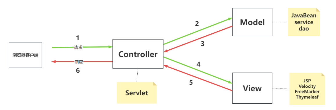 前端浏览器发送请求给web服务器,web服务器中的Controller接收到用户的请求,Controller负责将前端提交的数据进行封装,然后Controller调用Model来处理业务,当Model处理完业务后会返回处理之后的数据给Controller,Controller再调用View来完成数据的展示,最终将结果响应给浏览器,浏览器进行渲染展示页面。