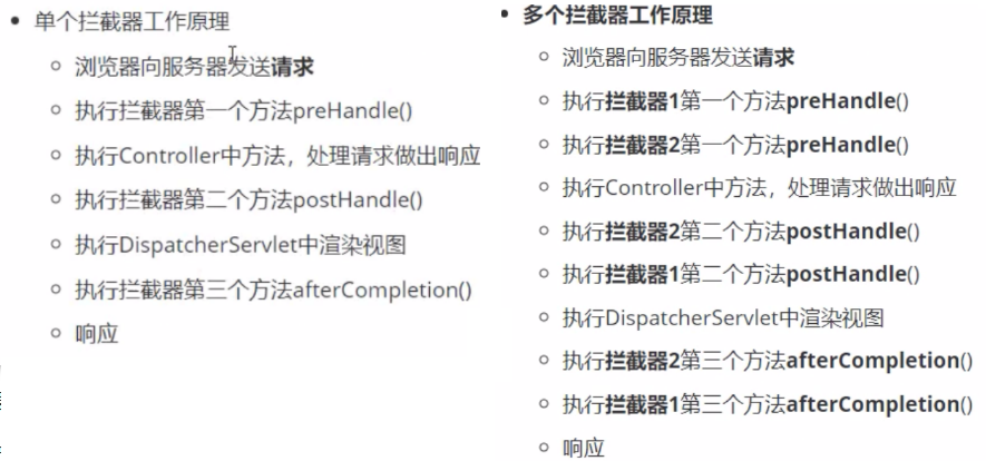 javapublic class HandlerExecutionChain { // 顺序执行 preHandle boolean applyPreHandle(HttpServletRequest request, HttpServletResponse response) throws Exception { for (int i = 0; i < this.interceptorList.size(); i++) { HandlerInterceptor interceptor = this.interceptorList.get(i); if (!interceptor.preHandle(request, response, this.handler)) { // 如果其中一个拦截器preHandle返回false // 将该拦截器前面的拦截器按照逆序执行所有的afterCompletion triggerAfterCompletion(request, response, null); return false; } this.interceptorIndex = i; } return true; } // 逆序执行 postHanle void applyPostHandle(HttpServletRequest request, HttpServletResponse response, @Nullable ModelAndView mv) throws Exception { for (int i = this.interceptorList.size() - 1; i >= 0; i--) { HandlerInterceptor interceptor = this.interceptorList.get(i); interceptor.postHandle(request, response, this.handler, mv); } } // 逆序执行 afterCompletion void triggerAfterCompletion(HttpServletRequest request, HttpServletResponse response, @Nullable Exception ex) { for (int i = this.interceptorIndex; i >= 0; i--) { HandlerInterceptor interceptor = this.interceptorList.get(i); try { interceptor.afterCompletion(request, response, this.handler, ex); } catch (Throwable ex2) { logger.error("HandlerInterceptor.afterCompletion threw exception", ex2); } } } }