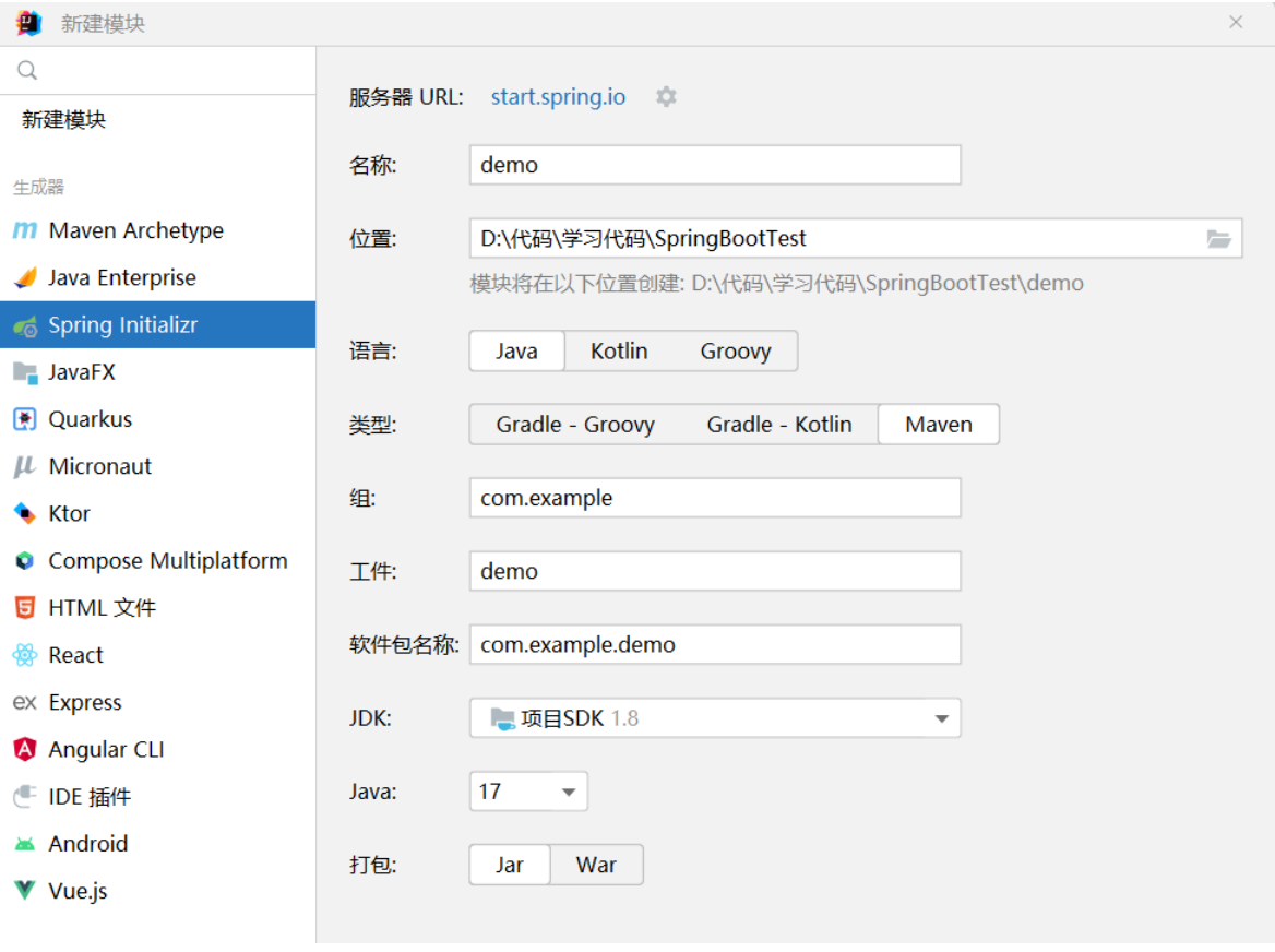 新建模块选择:Spring Initializr,填写对应信息后创建项目