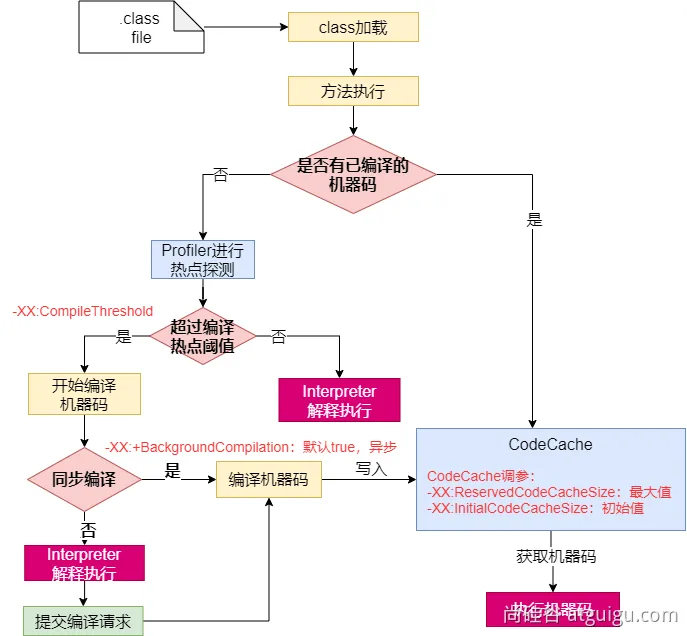 - 如果编译器做了一些比较激进的优化,比如分支预测,在实际运行时发现预测出错,这时就会进行反优化,重新进入解释执行,图中第⑤条执行路径代表的就是反优化。