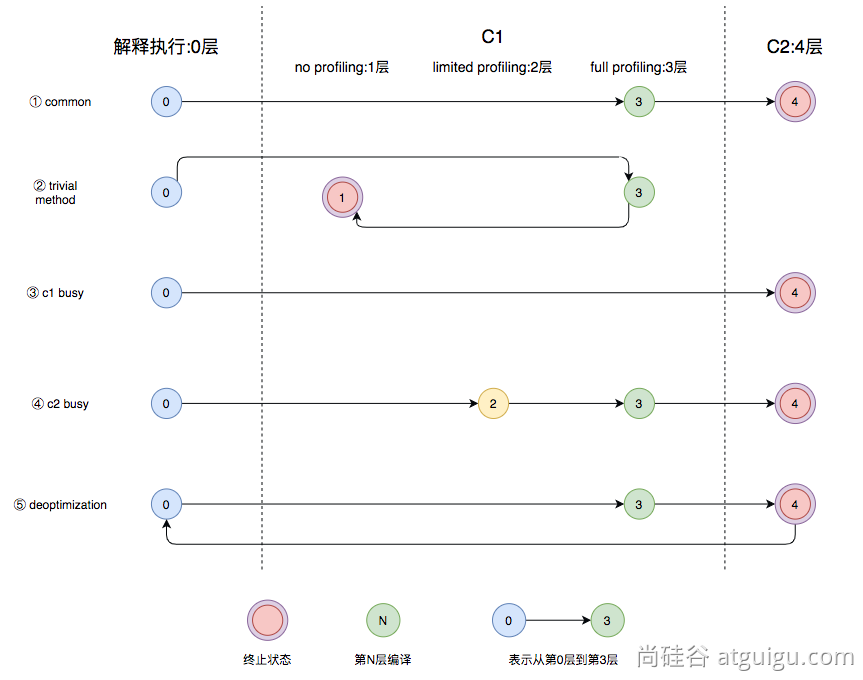 - 图中第①条路径,代表编译的一般情况,热点方法从解释执行到被3层的C1编译,最后被4层的C2编译。