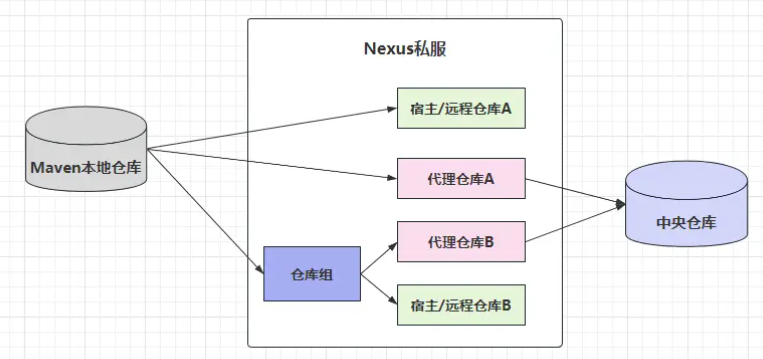 group | 仓库组 | 用来对宿主、代理仓库分组,将多个仓库组合成一个对外服务 |