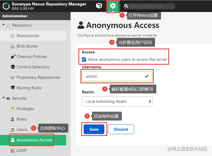 </server>2、Nexus中修改访问权限