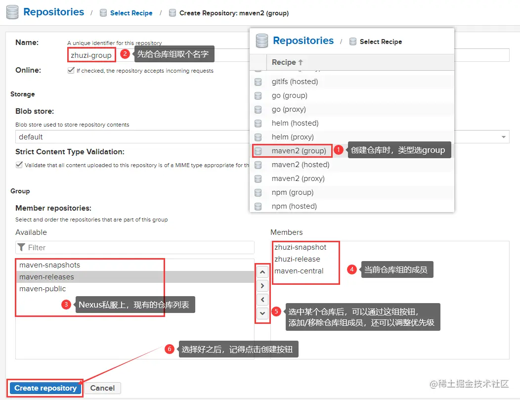 Members区域代表当前仓库组的成员,而这些成员会按照你排列的顺序,具备不同的优先级,越靠前的优先级越高(hosted宿主仓库必须在proxy代理仓库前)。