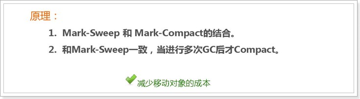 标记/整理算法不仅可以弥补标记/清除算法当中,内存区域分散的缺点,也消除了复制算法当中,内存减半的高额代价。