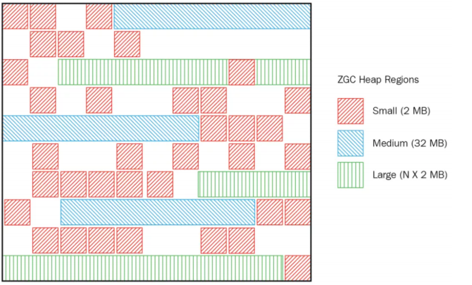 ZGC收集器是一款基于Region内存布局的,暂时不设分代的,使用了可并发的标记-整 理算法, 以低延迟为首要目标的一款垃圾收集器。 ZGC的Region可以具有如下图所示的大、 中、 小三类容量: